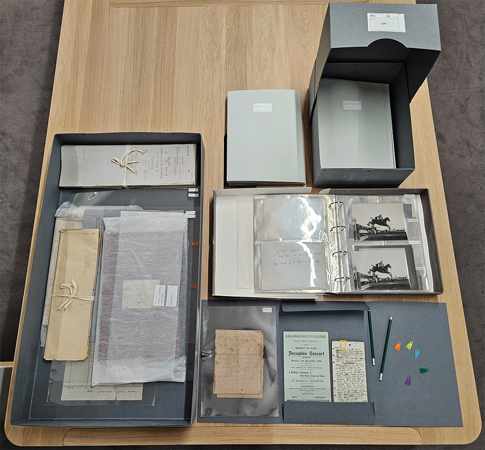 On first receiving a collection, an archivist removes all unsustainable and harmful material from the collection, and replaces these with more sustainable alternatives. Metal paperclips, staples and pins, as well as rubber bands and sellotape are removed, as these are harmful to the documents. These are replaced with special plastic paperclips to keep items together. Material is packed into acid-free folders, and placed in acid-free boxes. Photographs and particularly fragile textual documents are protected further using sheets or pockets made from a clear polyester called Mylar. All these materials are specifically designed for long-term use and reuse in archives.