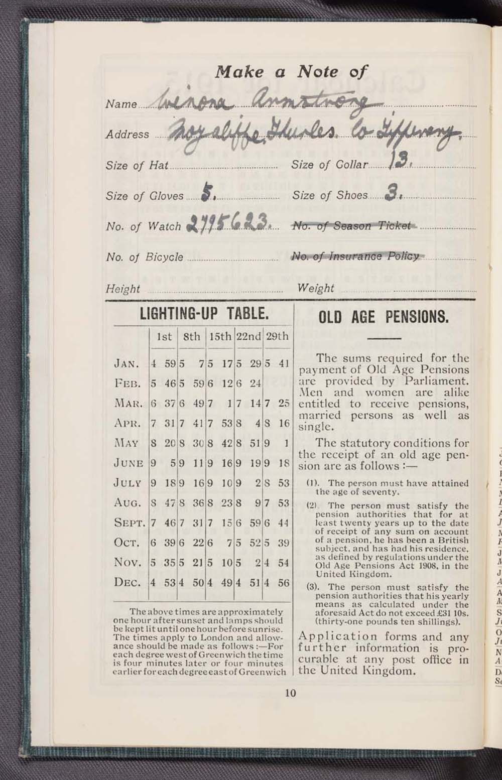 Printed diaries often contain a number of informational pages at the beginning of each volume, which give researchers valuable insight into what types of information and products were deemed most important to people of the time. Jess Armstrong’s diary from 1914 is a ‘Home Diary and Ladies’ Note Book’, published annually by Boots Cash Chemists, and as such, contains a wealth of information for the efficient running of a home at the turn of the 20th century,4 including: postal regulations; telegram charges; legal obligations in relation to the care of servants; ‘household’, ‘family’ and ‘sick room’ information, including how to fight infectious diseases, cure infant ailments and treat cases of poisoning; how to make a will (using a pre-prepared template supplied by Boots; lists of general abbreviations; and a ‘ready reckoner’ for converting pence (d) to pounds, shillings and pence (£, s, d).