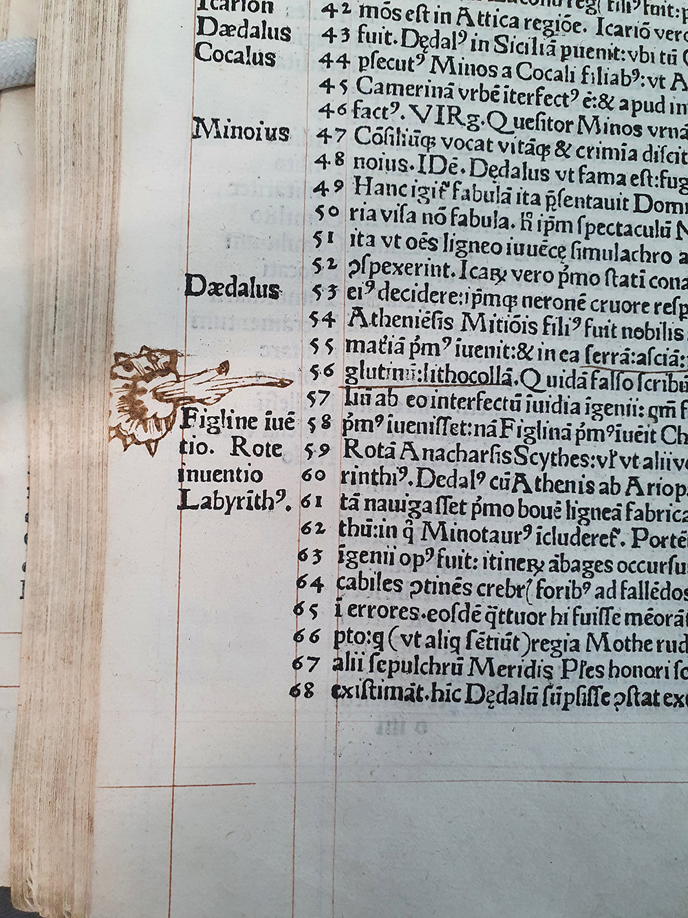 A finding aid, usually in the form of a pointing hand, manicules are used in both printed and manuscript form to signal a significant section in a work. Both forms can be found in Bolton Library B.19.31. Manuscript forms may reflect the personality, indeed the status of their maker: compare the very simple examples in this commentary on the Psalms, their efficient use in this alchemical treatise, and the fancy and the stern examples in Bolton Library Q.9.2 and Q.9.5.
